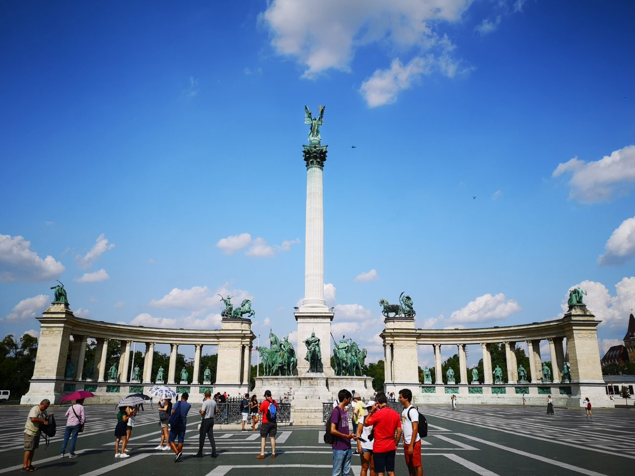 Siamo giunti alla Piazza degli Eroi, molto trafficata o meno da turisti a seconda del periodo della vostra visita. Durante l’estate (un pomeriggio di metà agosto) era abbastanza libera, per ammirarla in tutto il suo splendore e la sua grandezza. Oltre la piazza è presente il Parco Városliget con al suo interno il Castello Vajdahunyad e varie sculture, tra cui lo scriba anonimo.